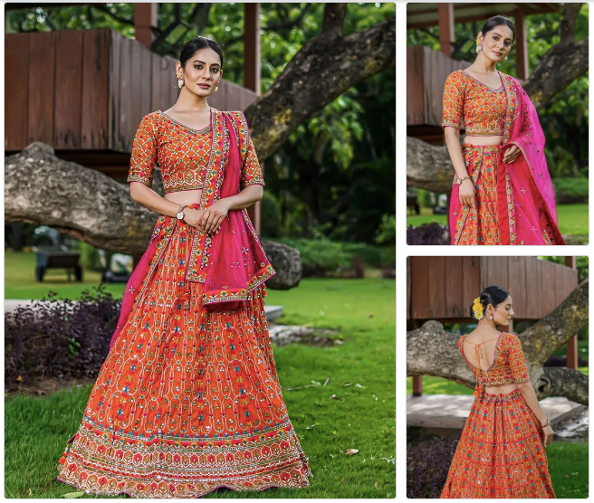 - Outfit Idea: A flowy orange lehenga with a pink dupatta or a fusion gown with mirror work.