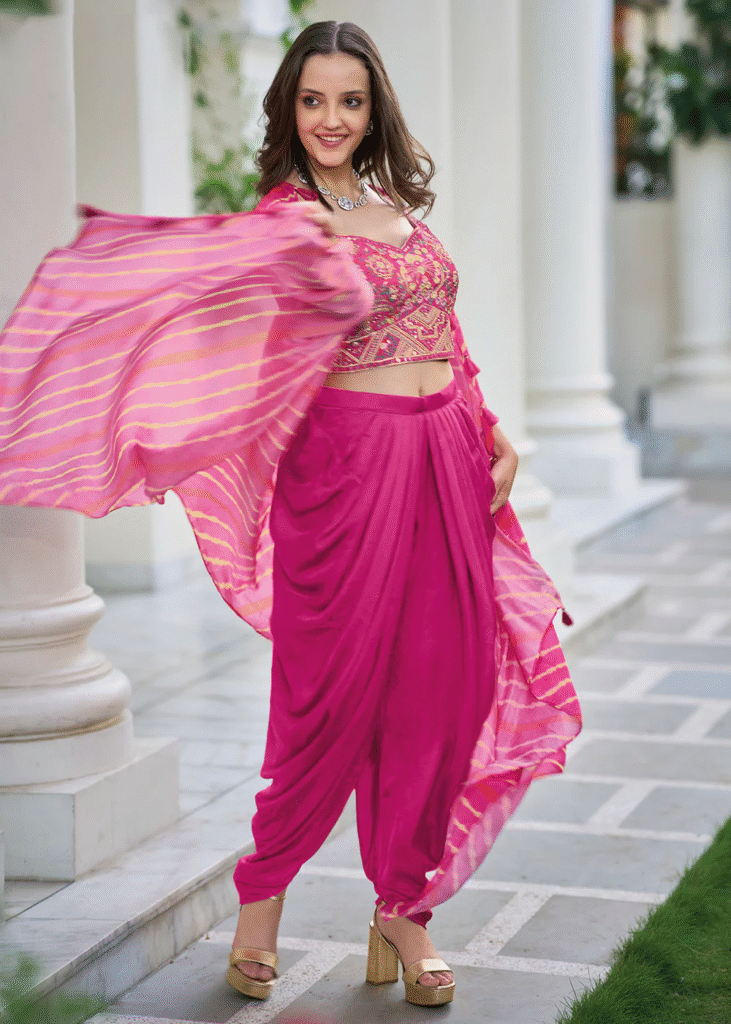 - Outfit Idea: A layered pink skirt with a crop top, a pastel embroidered gown, or an Indo-western dhoti outfit.