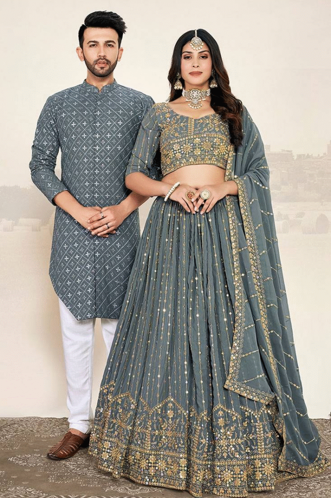 - Outfit Idea: Go for a sequin grey lehenga, a kurta set with heavy dupatta, or a layered skirt with a contrast blouse.